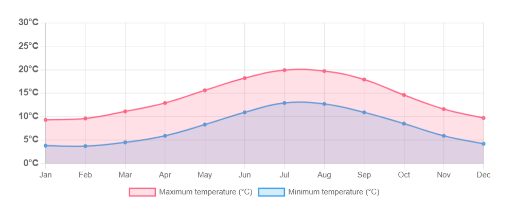 Ireland has a temperate maritime climate, which is generally mild, damp, and changeable throughout the year. Summers are cool to mild, with daytime temperatures usually ranging from 15°C to 20°C (59°F to 68°F), while winters are mild, with daytime temperatures around 5°C to 8°C (41°F to 46°F). Rainfall is frequent but rarely heavy, and clouds or light drizzle can occur in any season.