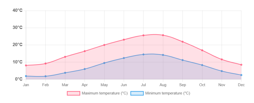 The Loire Valley in France has a temperate climate with relatively mild winters and warm summers. Daytime temperatures in summer typically range from 20°C to 28°C (68°F to 82°F), while winter temperatures usually sit between 3°C and 10°C (37°F to 50°F). Spring and autumn are generally mild and comfortable, with moderate rainfall and pleasant conditions for exploring the countryside and the region’s famous châteaux.