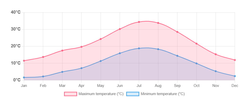 Segovia in Spain has a continental climate with hot summers and cold winters. Summer daytime temperatures typically range from 25°C to 32°C (77°F to 90°F), while winter days are usually between 3°C and 10°C (37°F to 50°F), with nights often dropping below freezing. Spring and autumn are generally mild and pleasant, with moderate temperatures and relatively low rainfall.